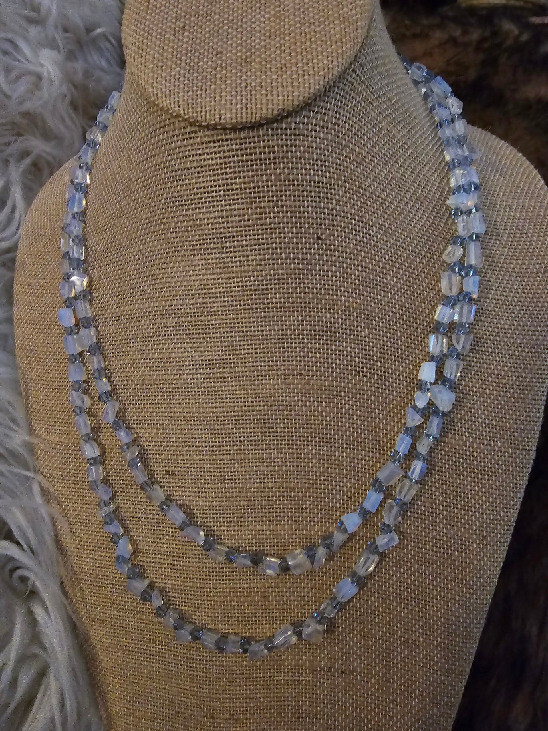 Opal moonstone chips lite blue glass chips, double strand toggle clasp 22" necklace