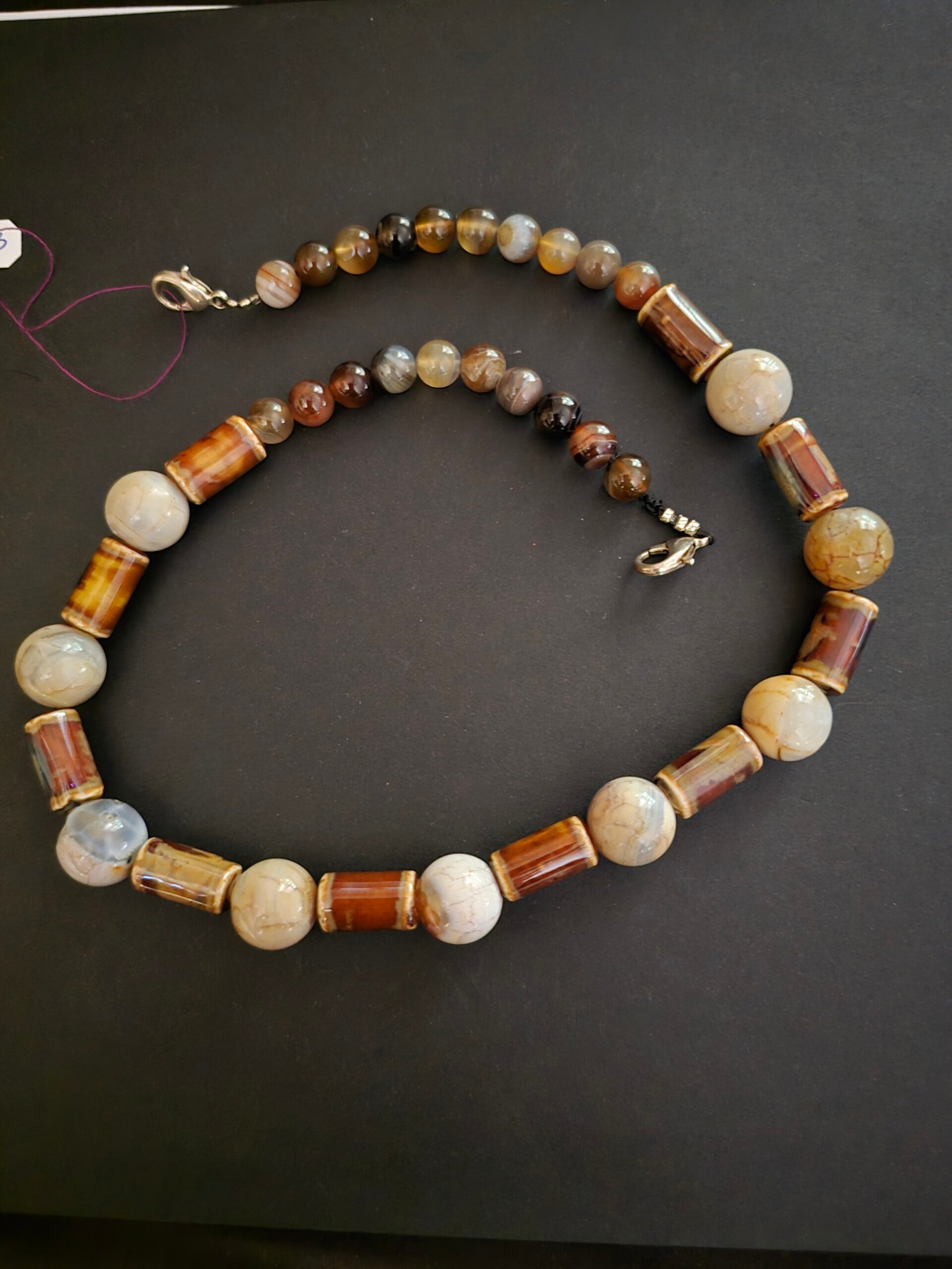 Lg Agate beads with brown cylindrical ceramic lobster claw 19" necklace