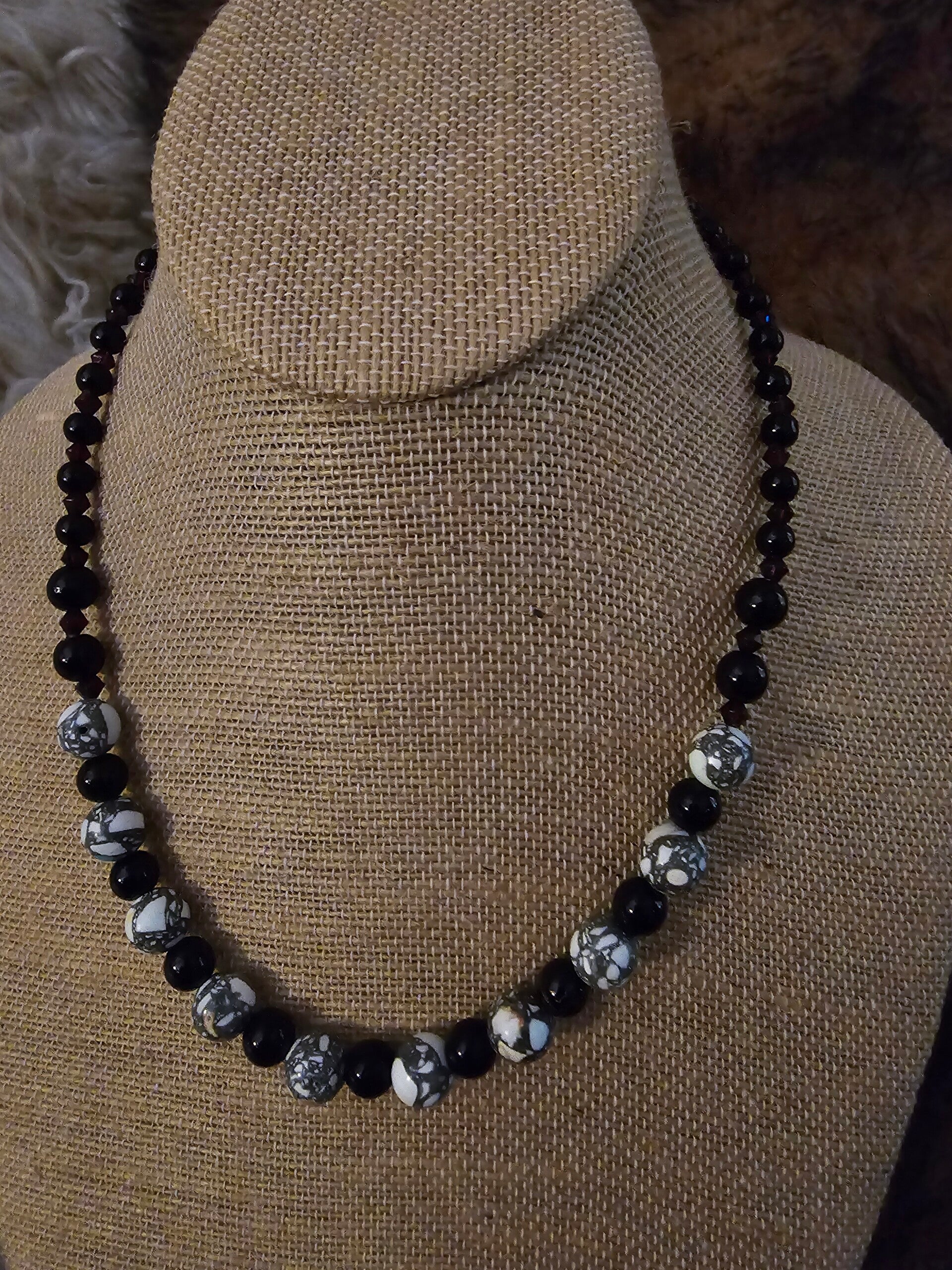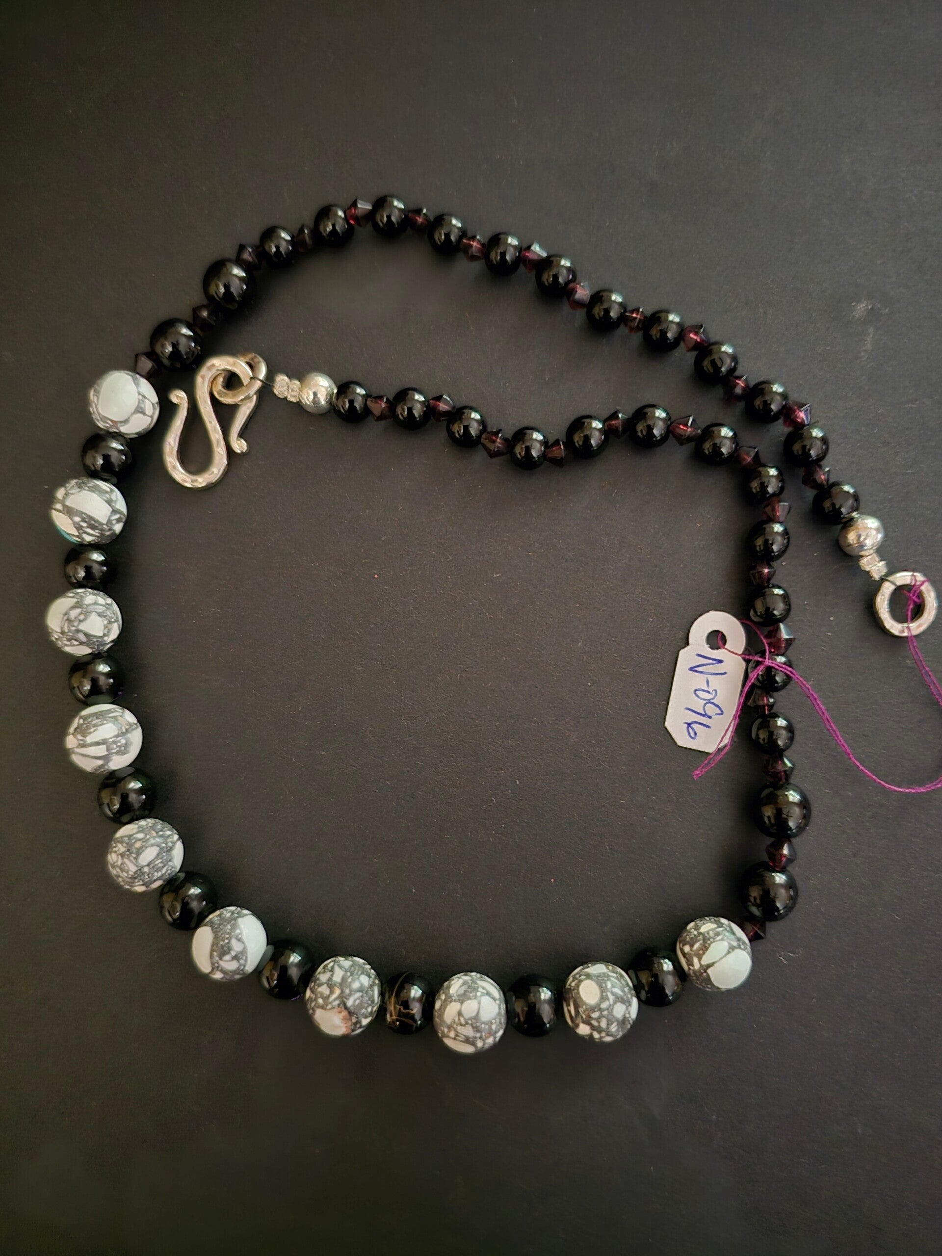 Howlite blackjasper, small amethyst spacers, silver S clasp 20" necklace