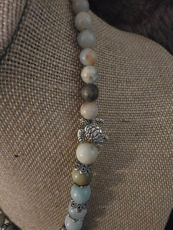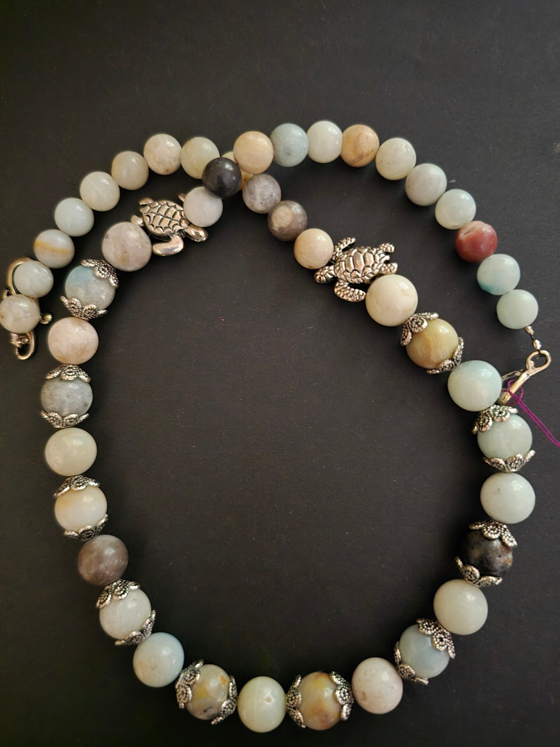 Agate with silver turtles and rochelles, S clasp 19" necklace